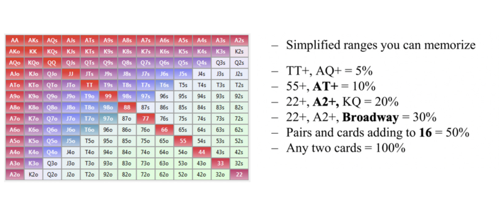 For now, you can memorise the below entries to get an intuitive sense of the % of hands that a range represents - I.e.: TT+ comes up approximately 5% of the time.