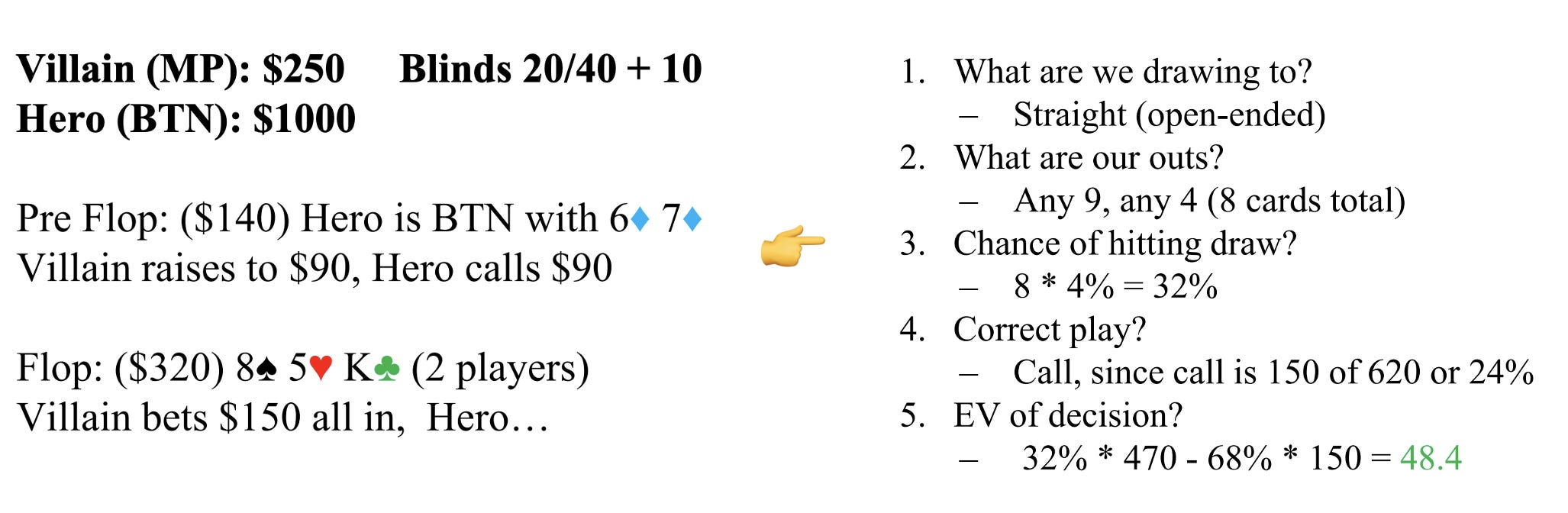 In general, decision rules will be made based on EV. For example, — If Win% = 25% and you are facing a $60 bet into a pot of $100 à EV = 25% * (100+60) — 75% * 30 = 17.5