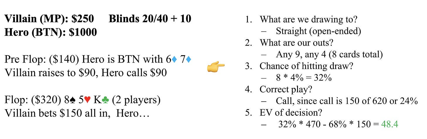 Pot Odds = Decision rule to call a bet, the relationship of the call amount to the size of the pot. By quickly calculating pot odds and win% — you get a shortcut to EV.