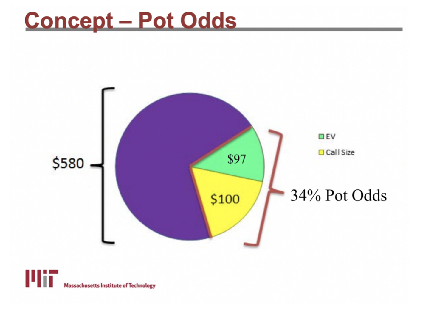 Example: If the bet were $100 into a pot of $380. Pot Odds would be $100/$580, where $580 = (Pot + Bet + Call). Hero’s call contributes ~17% of the pot. He can profitably call if Win% > 17% of the time.