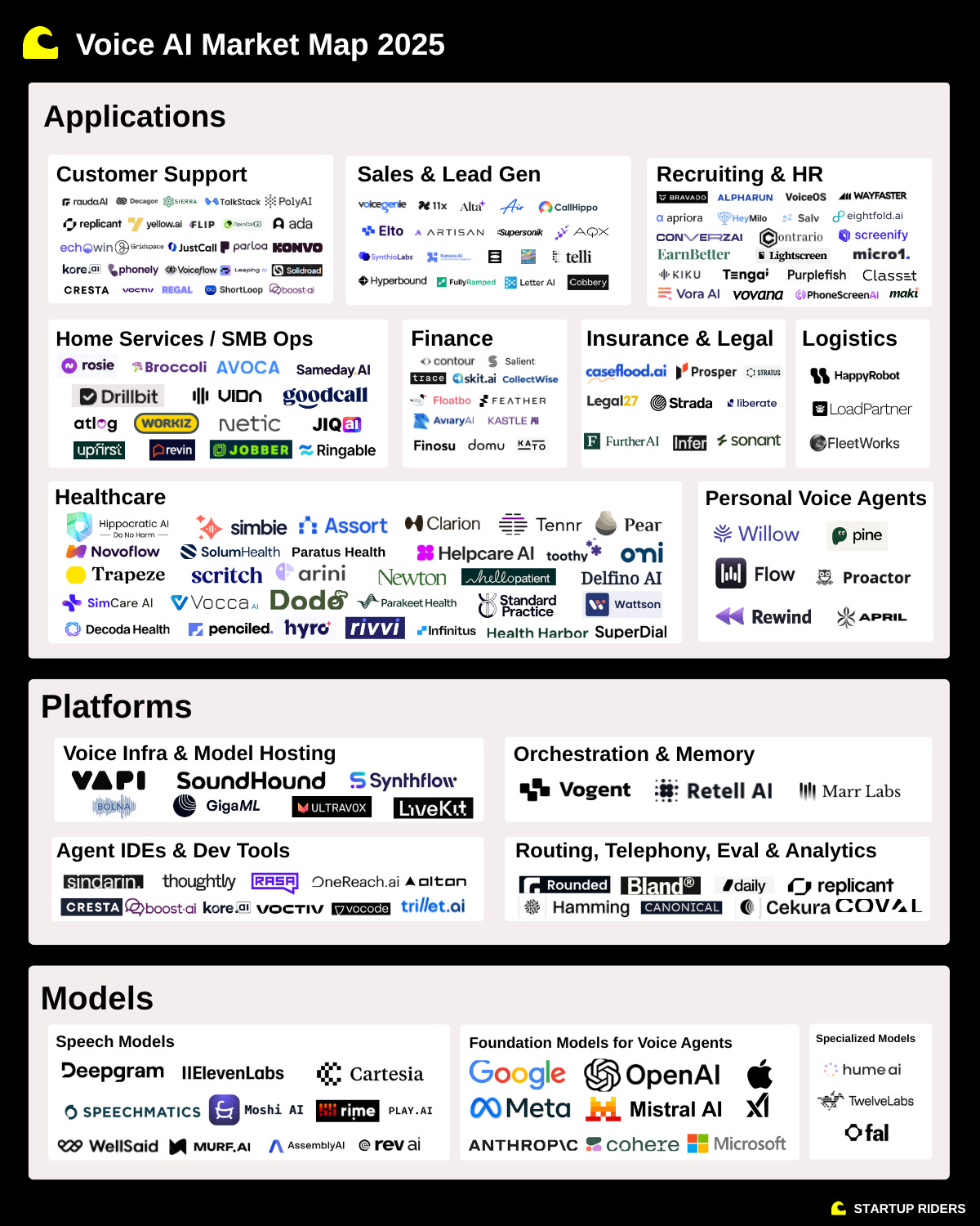 This is where the stack comes together. We mapped out 100+ companies across the Voice AI landscape — models, infra, and apps.