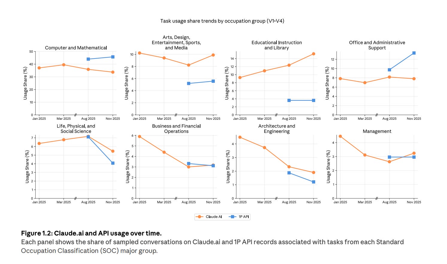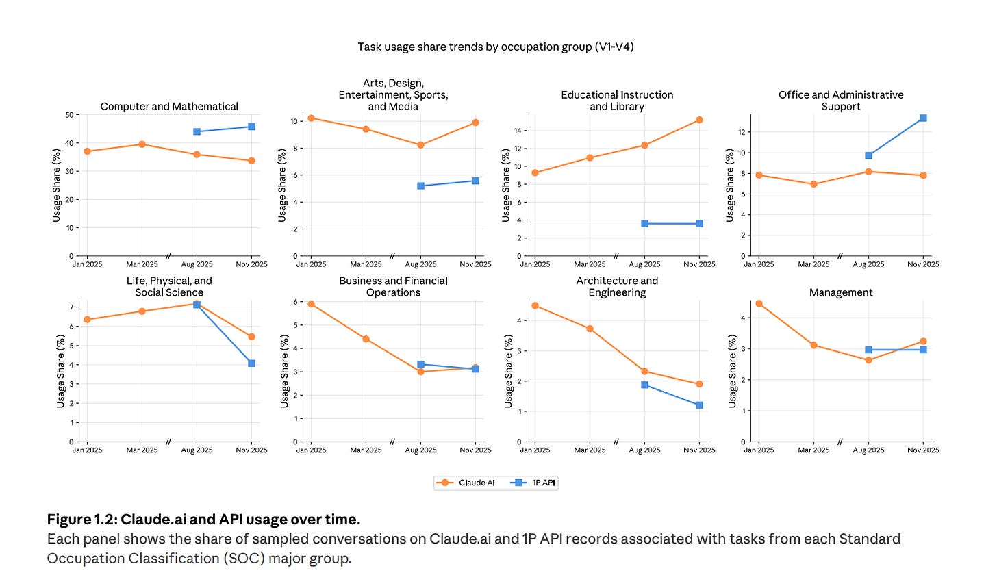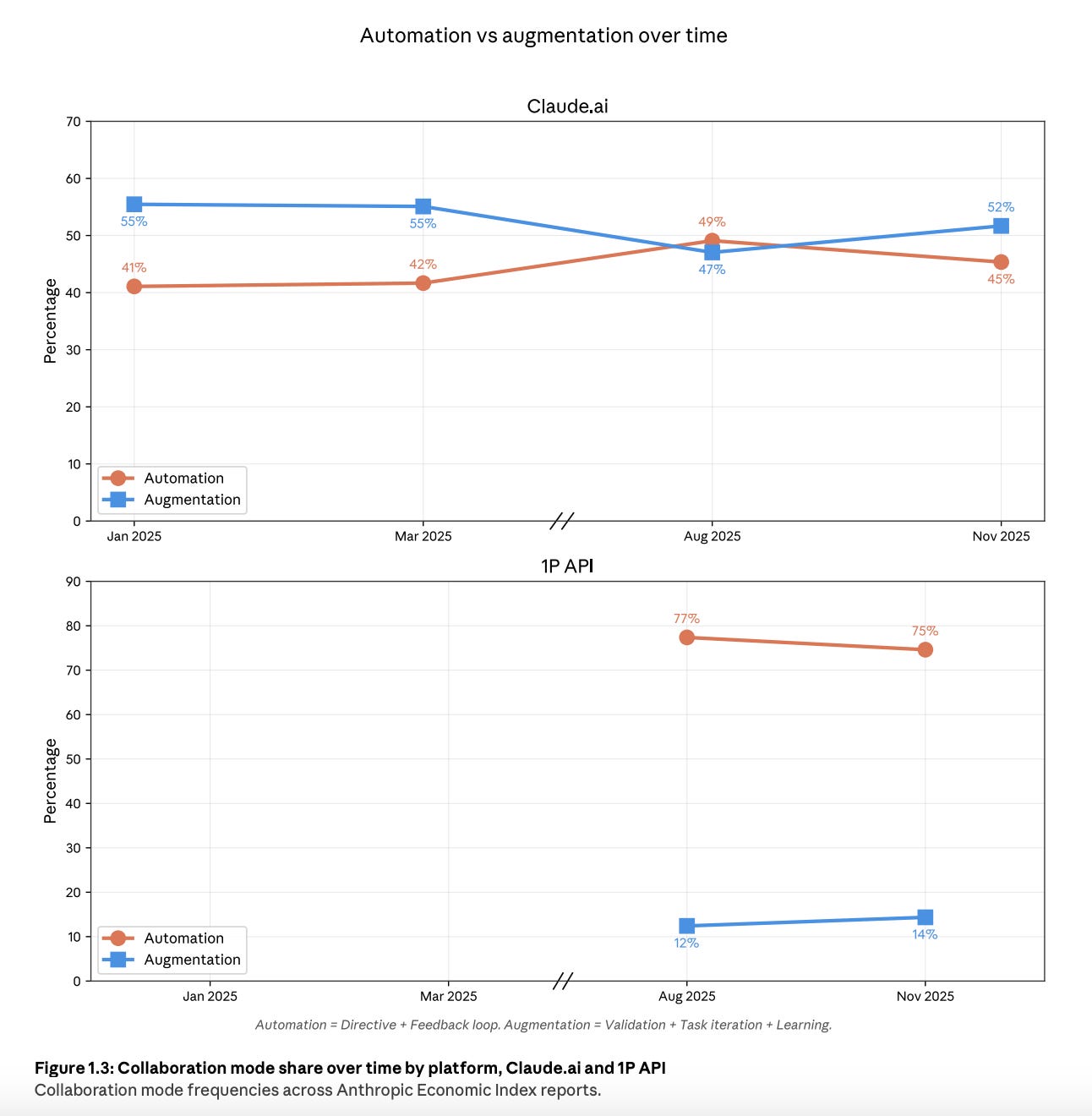 And the trend is interesting because Anthropic shows automation had risen earlier, then came back down, with augmentation becoming dominant again. They mention product changes like file creation and workflow skills as possible drivers.