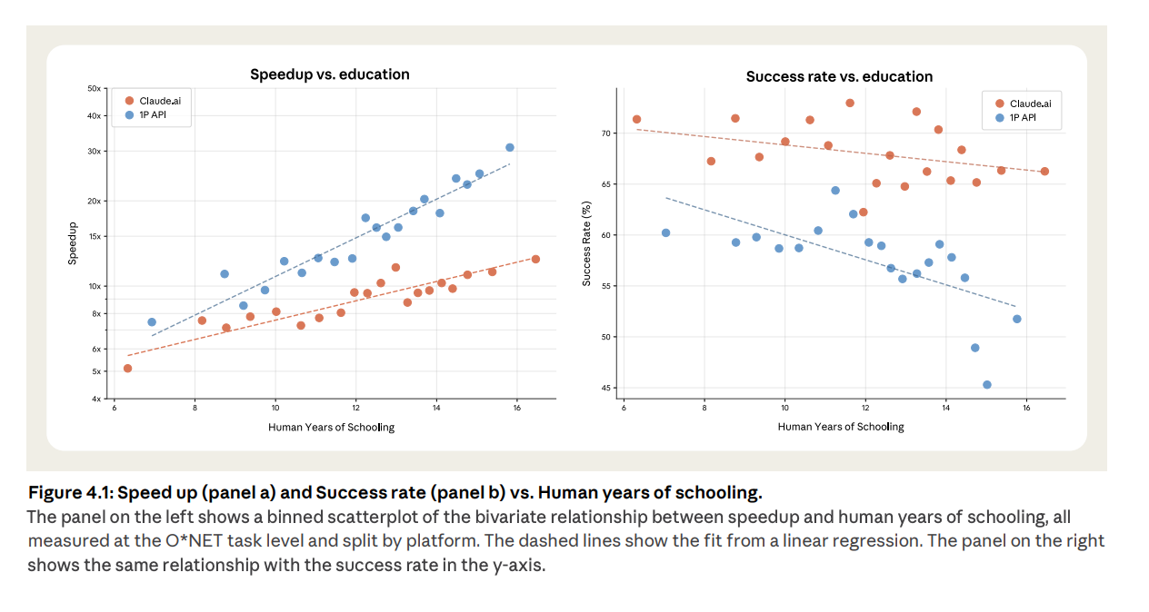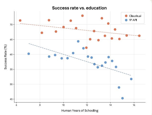 Anthropic estimates “speedup” by comparing how long a task would take a human alone vs human plus AI. When they plot that against task complexity (proxied by years of schooling needed to understand the prompt), the curve goes up.