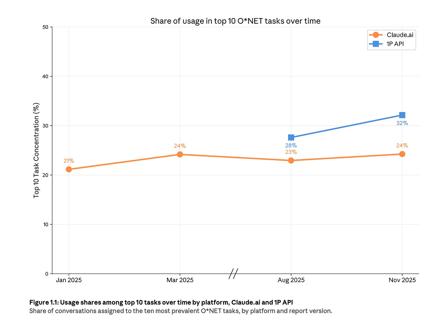 Anthropic sees over 3,000 unique work tasks on Claude.ai, but the top 10 tasks account for 24% of sampled conversations. That concentration also shows up even harder in enterprise API usage, where the top 10 tasks are 32% of traffic.