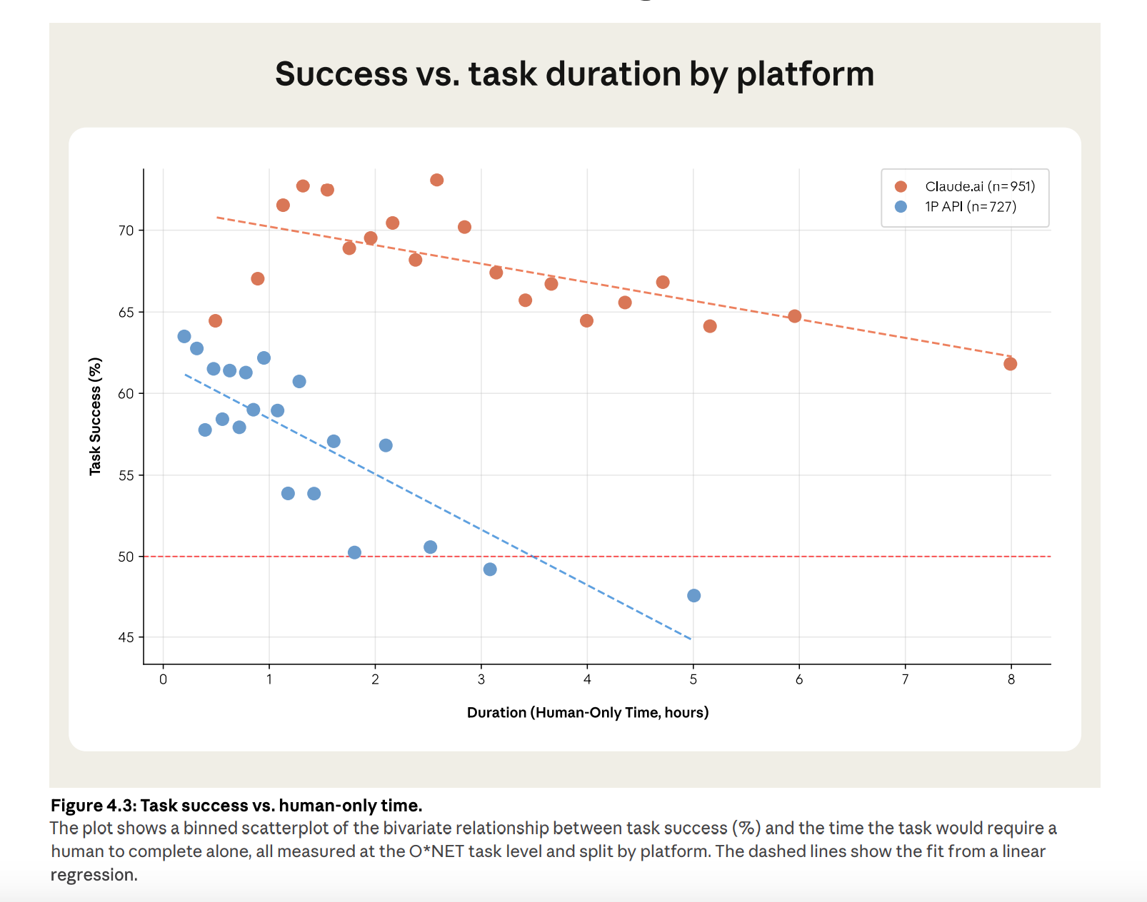 The same chart tells a second story. On Claude.ai, success rate declines much more slowly with task duration. Anthropic extrapolates that Claude.ai would hit 50% success at about 19 hours.