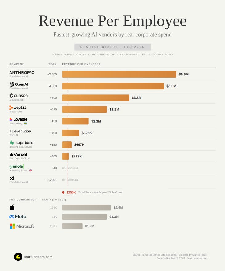 For context, Apple does roughly $2.4M per employee. AI-native startups are already matching or beating the Mag 7 on this metric with a fraction of the headcount: