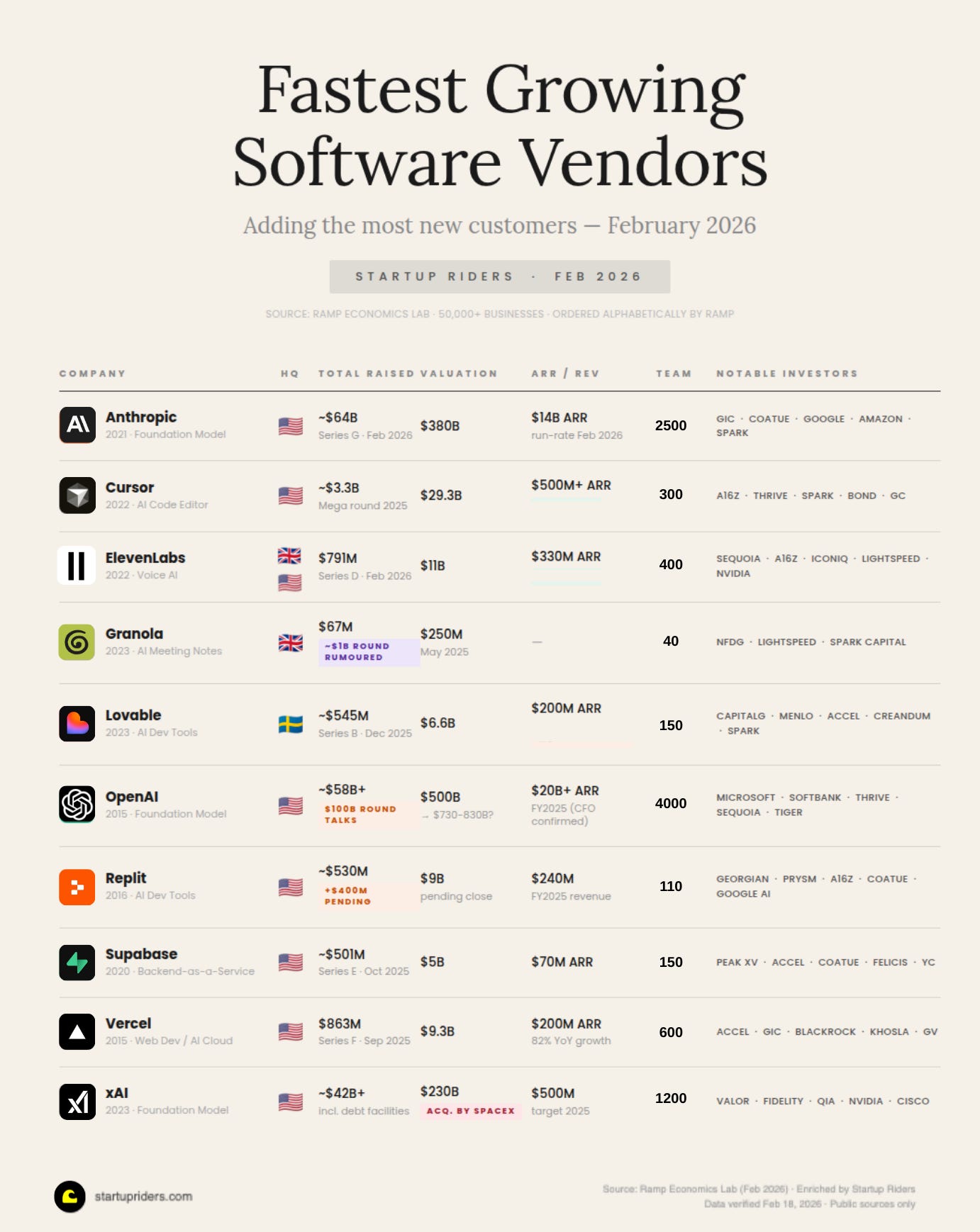 📐 Quick note on methodology: Ramp’s “fastest growing software vendors” ranks companies by net-new customer additions on their platform. It skews US, mid-market, and tech-forward. I suspect it doesn’t measure total revenue or usage depth just adoption velocity. I enriched the top companies with funding, valuation, team size, and ARR data from public sources. Treat all numbers as directional.