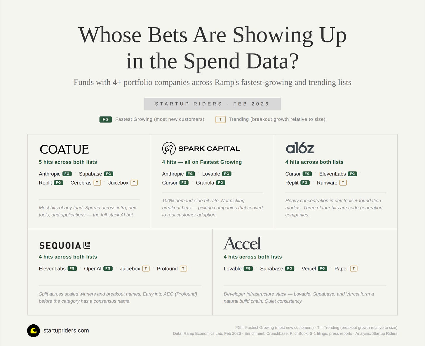 I mapped which funds appear most across both Ramp lists, fastest-growing (most new customers) and trending (breakout growth relative to size), to see who’s picking winners on both sides of the data: