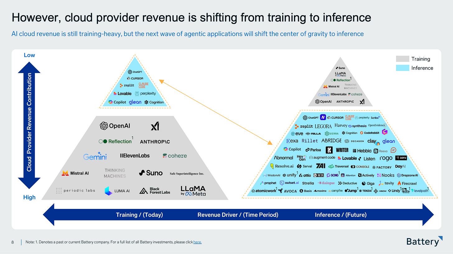 Up to now, most AI cloud revenue has come from training, which requires big bursts of compute, happens infrequently, and is tightly concentrated among a few frontier labs (what the left side of the slide above shows).