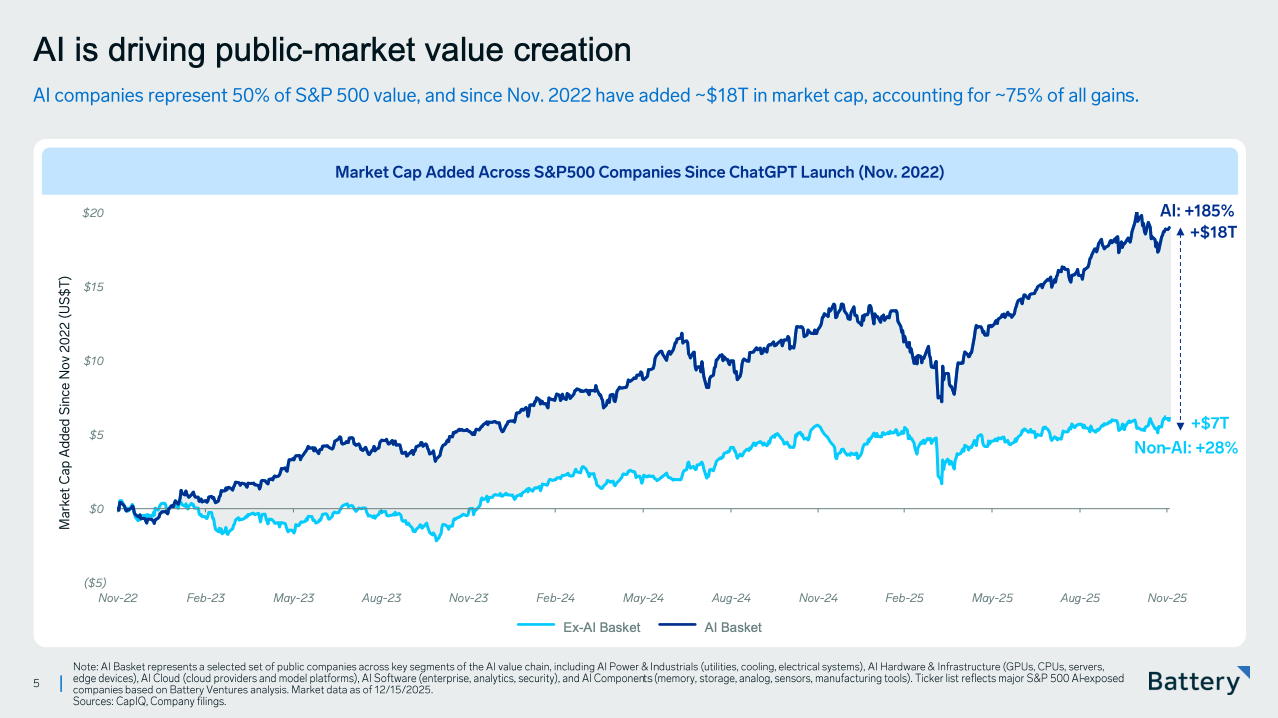Since ChatGPT launched in Nov 2022 weâve seen AI-exposed companies adding around $18T in market cap... That is about 75% of all S&P 500 gains in the same period and are now close to 50% of total S&P 500 value.
