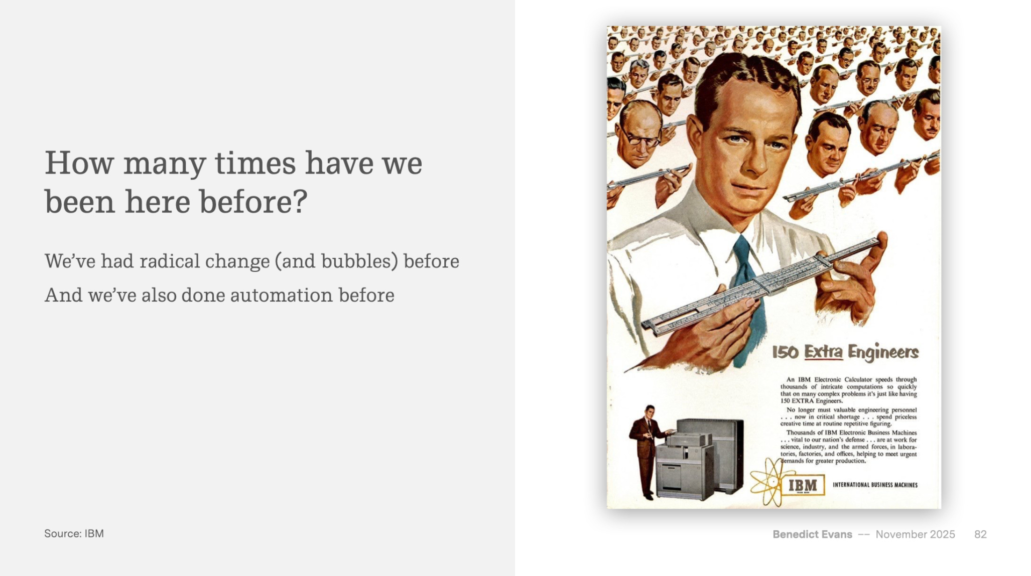 The IBM â150 extra engineersâ advertisement above is almost identical to the conversations happening now about LLM job displacement. The technology shocks of the 1950s, 1980s, and 2000s followed similar curves including a period of panic, adaptation, productivity gains, and then new categories of work.