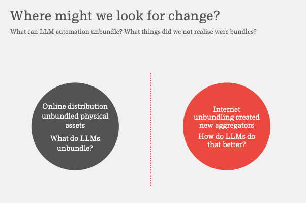 The internet unbundled physical things (newspapers â articles, stores â SKUs). AI now unbundles office work, the long, messy processes that only existed because humans had to read and decide things.