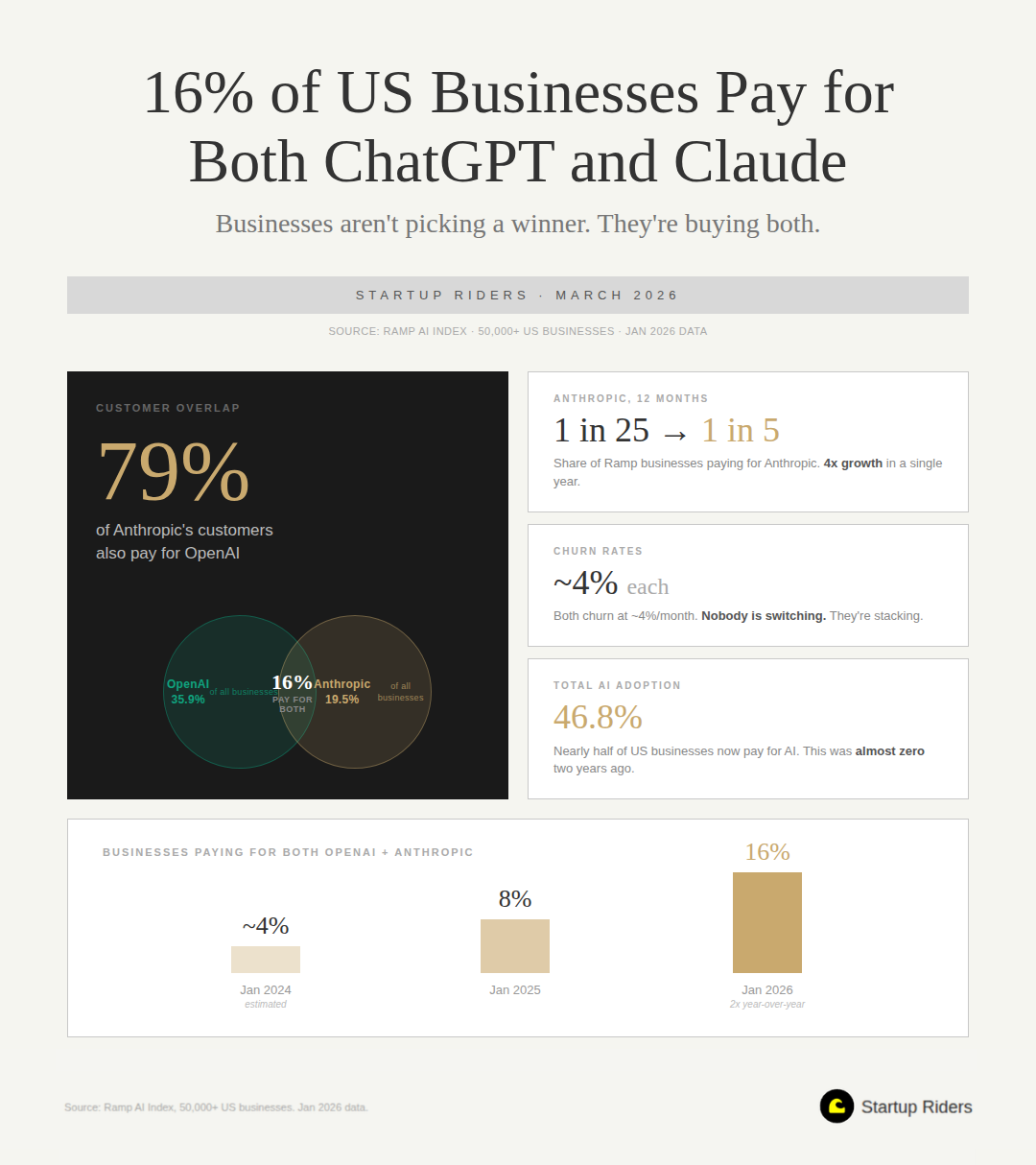 2. 16% of US businesses now pay for both ChatGPT and Claude. Double from a year ago.