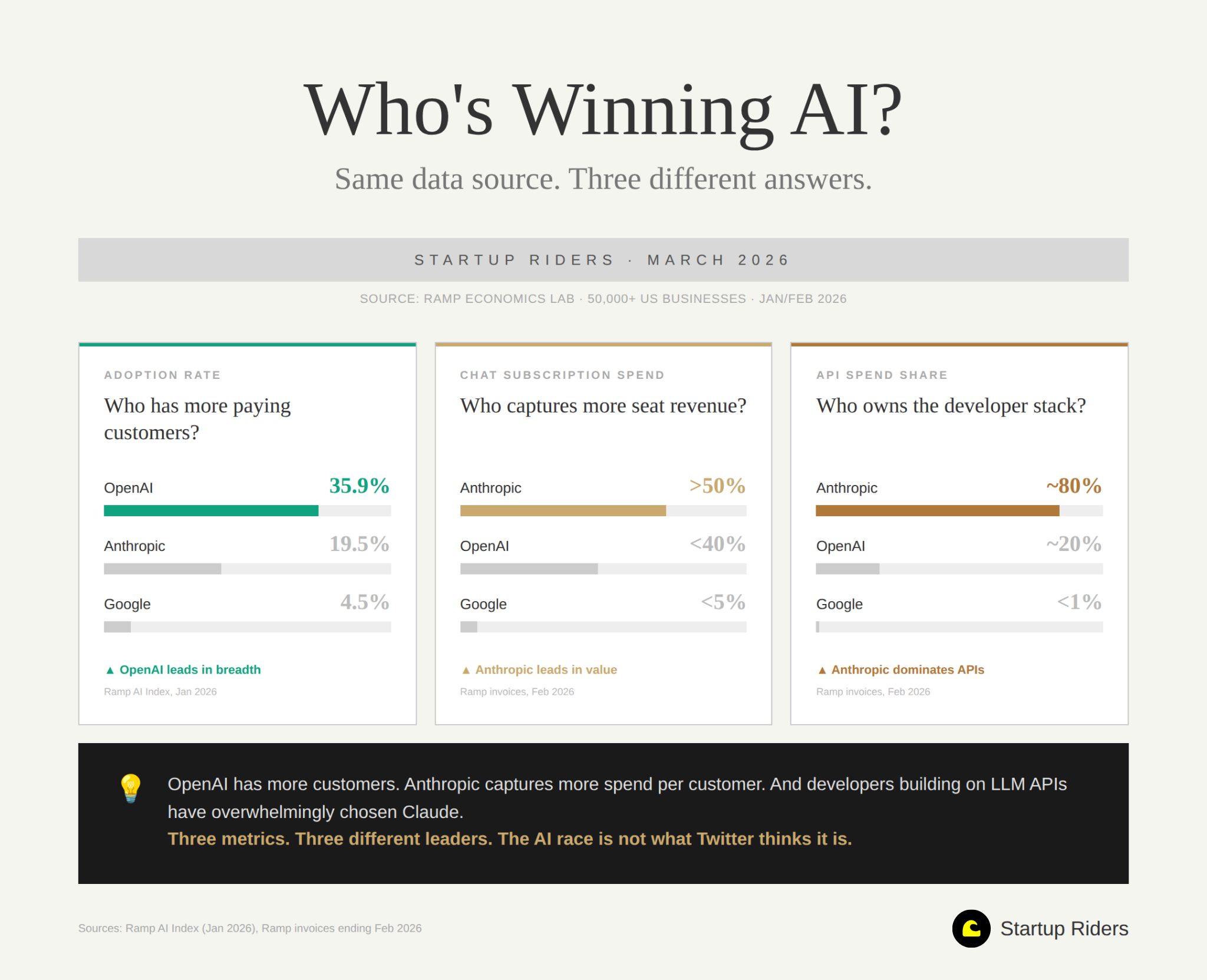 đ Quick note on methodology: Ramp tracks 50K+ US businesses via corporate card and bill pay. It skews US, mid-market, tech-forward. The index measures three things separately (adoption, chat spend, API spend) and most viral takes conflated them into one âmarket shareâ number. Treat all numbers as directional.