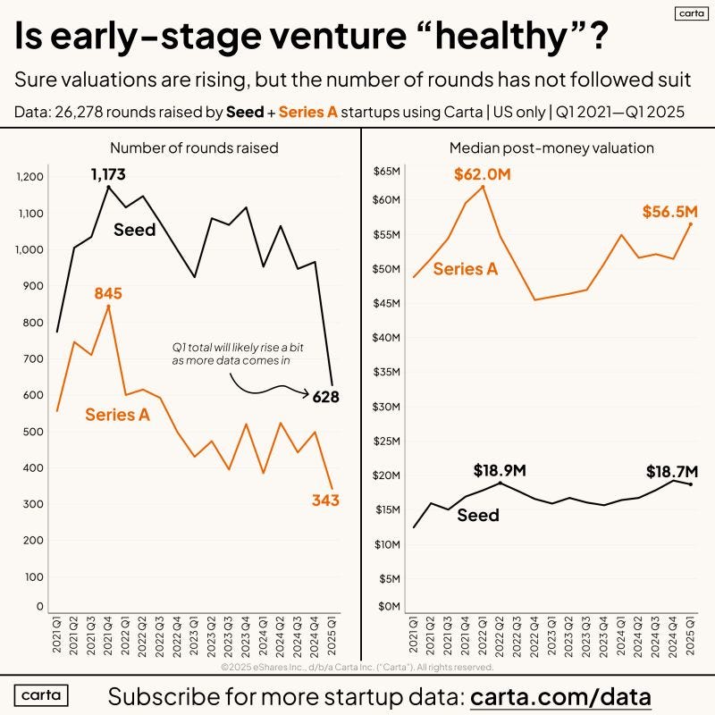On the one hand, AI bullishness is pushing up the valuations of AI-native early stage companies, which dominate headlines, which paint a rosy picture of startupland.