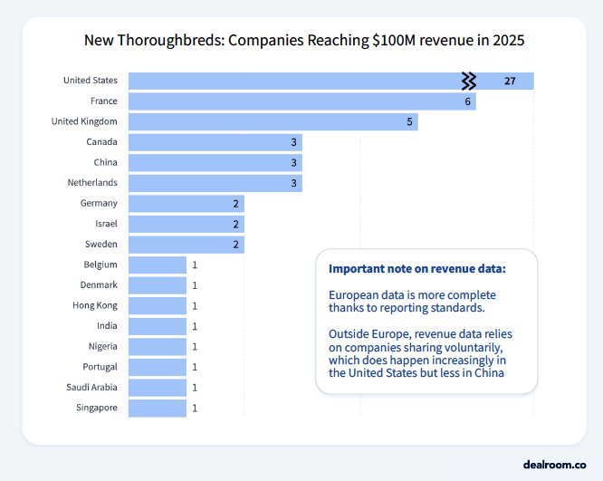Europe looks fragmented country by country. But if you sum Europe, you get roughly 21 new $100M-revenue companies which puts Europe much closer to the US than the chart suggests at first glance. The US creates revenue winners at scale in fewer companies whereas Europe creates them across many countries, sectors, and markets, with smaller individual outcomes but a similar aggregate.