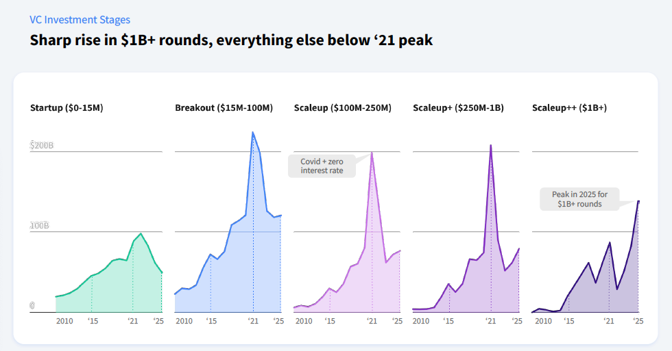 There was a big jump in the number of 1B+ rounds, and a record 18 rounds that were $2B+. Which is obviously dominated by AI infrastructure and frontier model companies (OpenAI, xAI, Anthropic, Safe Superintelligence, Mistral etc.)