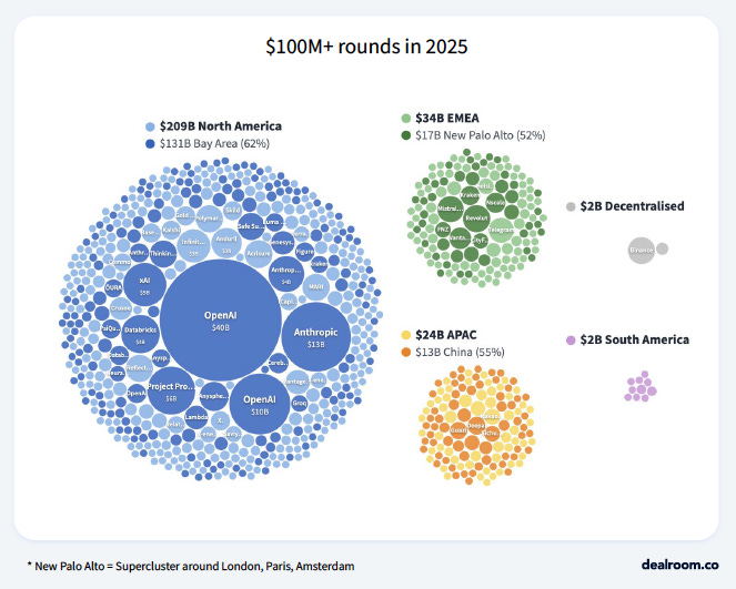In 2025 Bay Area companies raised $131B in $100M+ rounds, which is more than EMEA ($34B) and Asia Pacific ($24B) combined. Zooming out, 46% of global scale-up capital went to one region (74% went to one country, which is wild).