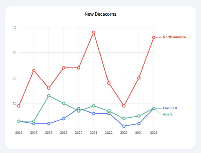 This is where North America is the undisputed MVP, producing 36 new decacorns in 2025 whereas Europe and Asia added only 8 each.