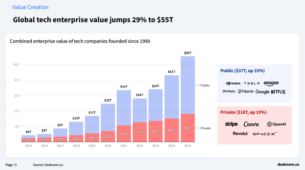 Global tech enterprise value hit $55T, up 30% percent in one year. This should raise some suspicious eyebrows especially considering that $18T is still private.
