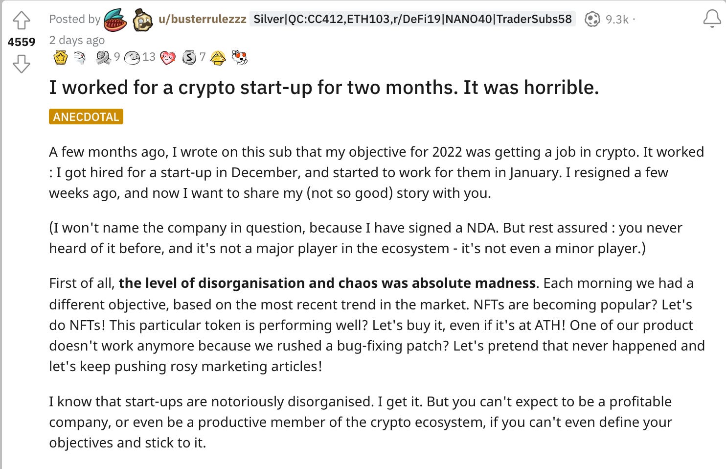 If you are either thinking of joining a web3 project or invest in one, I urge you to ask founders very direct questions. There is no shortage of horror stories. Sure, these happen everywhere (not just web3), but imo we should be extra careful in this market.